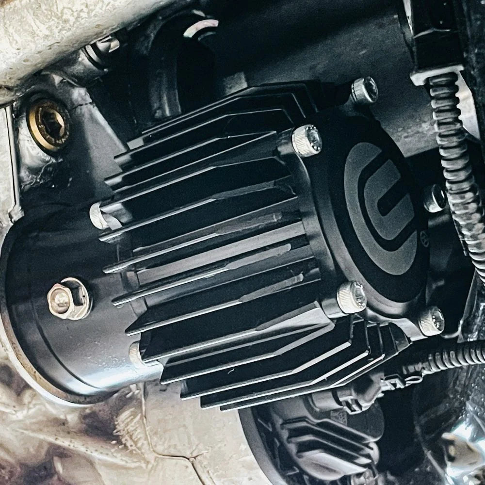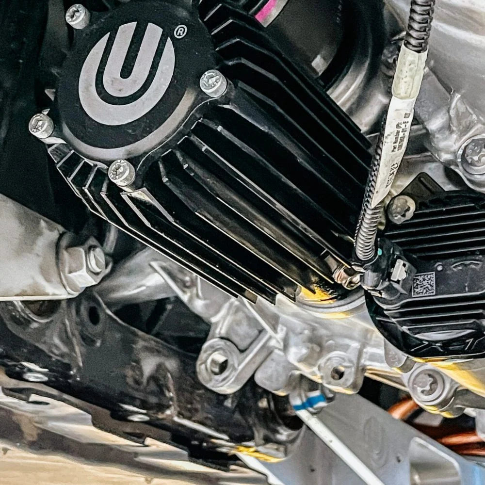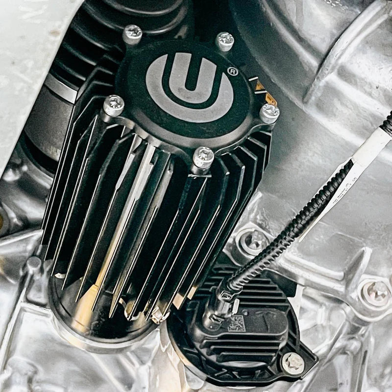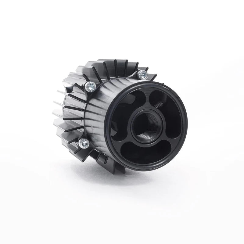 Run cooler. Run longer. The Enduro Drive Unit Oil Cooler and Magnetic Filter is a direct replacement of the factory oil filter on Model 3 and Model Y drive units. Drive unit cooling capacity is increased by using an efficient radial finned design combined with an approximately 10% higher capacity enclosure.