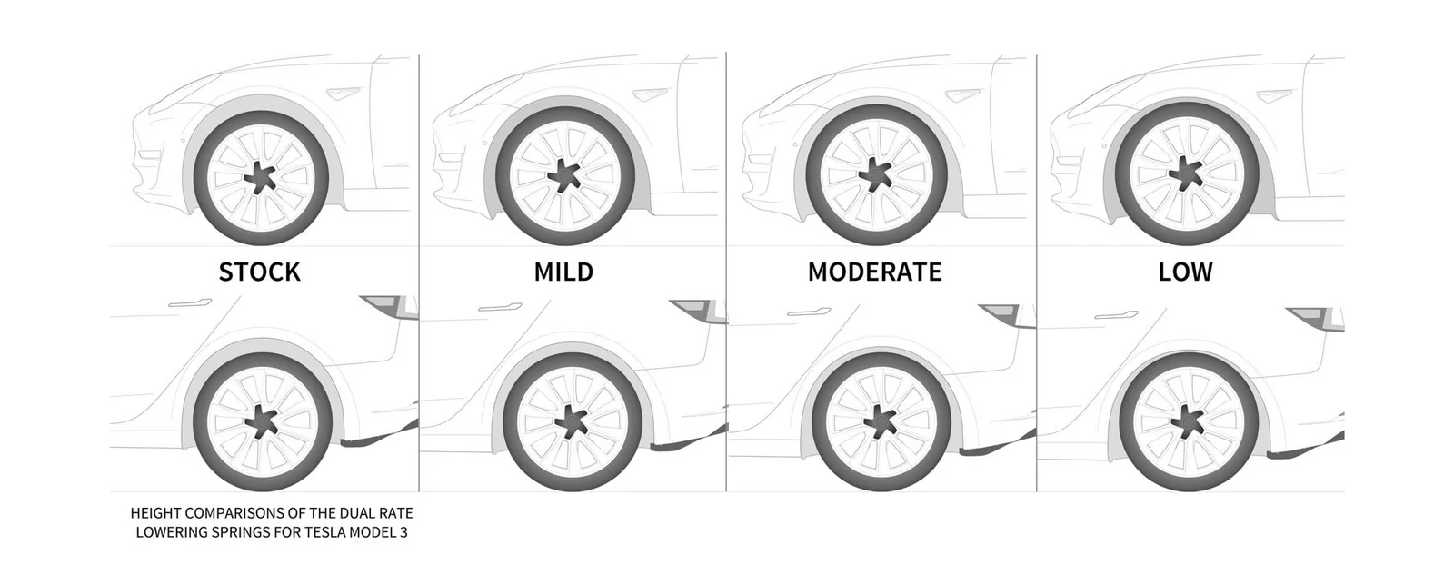 "I really like the new moderate lowering spring for my Model Y performance. The set lowered the car by roughly 1 inch (2.5cm) I have the feeling that the car provides a smoother ride than stock. You feel it when driving over small bumps. The car is still stiff but I like it better that stock and obviously it looks amazing.